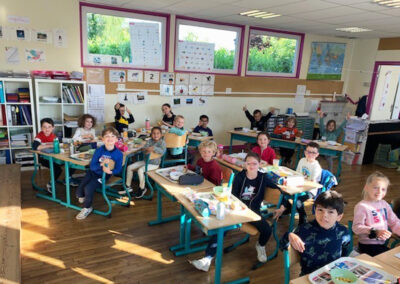 « Nos chères voisines » … C’est ainsi que les élèves et l’équipe enseignante nous appellent depuis l’invitation, il y a deux ans, de Marion Alloyer, en charge d’une classe CP-CE1 et de cette école, à rencontrer ses élèves pour répondre à leurs questions sur qui nous sommes, nous qui habitons la si grande maison qui surplombe leur établissement ! Cette lettre portait l’invitation que nous participions, dès 8h45 du matin, à un « PETIT DEJEUNER », nouvelle initiative qui visait à sensibiliser les élèves -de la maternelle au CM2- sur « une alimentation équilibrée pour être en bonne santé ».