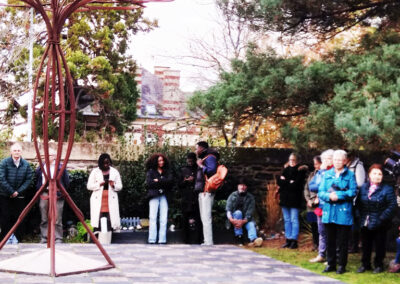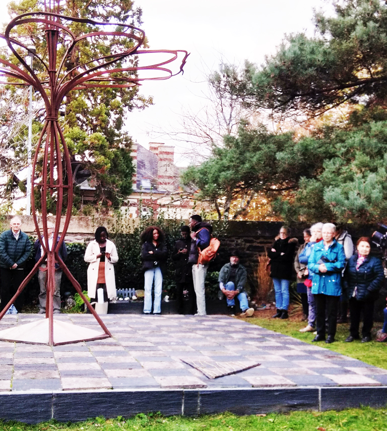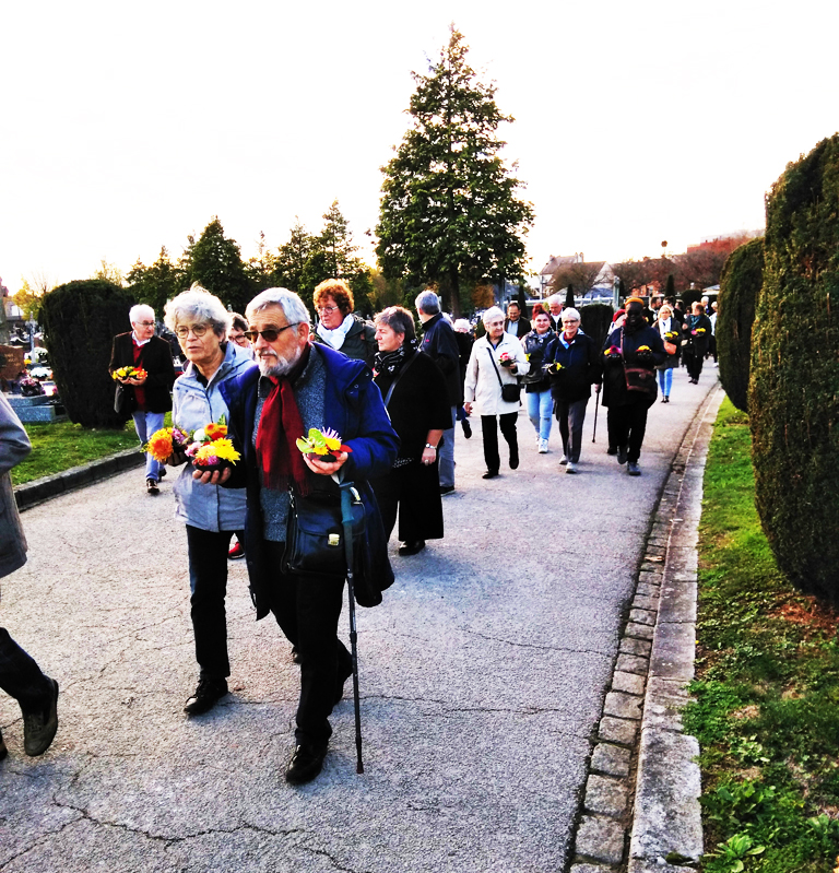 Puis, les participants sont invités à se rassembler autour de la Sépulture commune surmontée d’une sculpture, « La fleur de vie » réalisée par le Collectif, pour honorer les morts ensevelis en cet endroit.