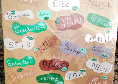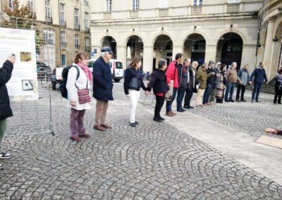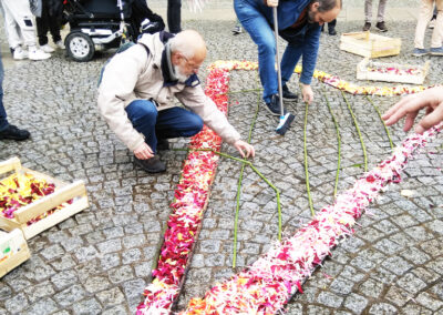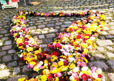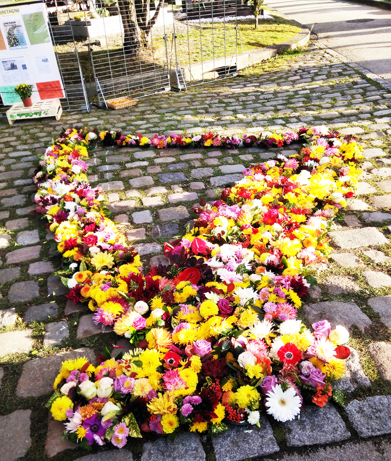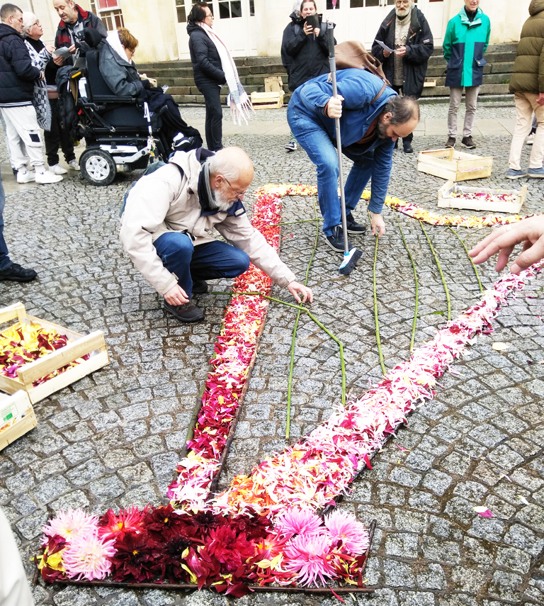 – La réalisation d’une œuvre éphémère, sur la Place de la Mairie : cette année c’est une harpe avec une corde cassée dessinée en fleurs sur le bitume. Cette manifestation se termine par un cercle de silence en mémoire des morts de l’année.