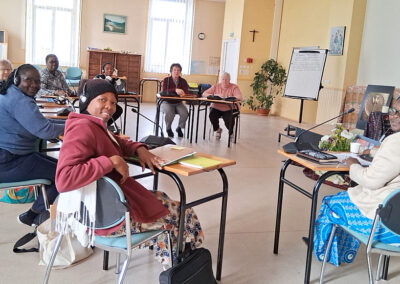 Those present are: Sisters Amelie Zougmore Burkina Faso; Mercy Aghahowa Nigeria; Julienne Matchou Wanie Cameroon; Emiola Fakorede France /Belgium; Yvette Rainville and Mme Donna Woodruff the director of finance USA; Mr. Thomas Dorlanne responsible for finance and administration, Simone Dontsa Jiohou assistant to the general bursar, in formation; Anne Donnelly the general bursar; Olga Kiendrebeogo general councillor. The bursars of the delegations of Chili, and Kenya, and the bursar of England/Ireland were not present. As we do not speak the same language (English and French) we have two translators: Saideh and Tatiana.