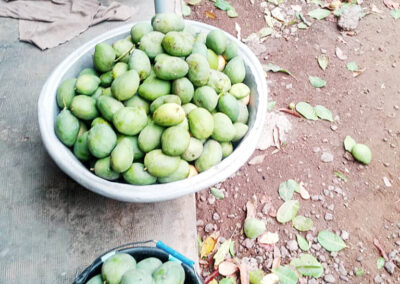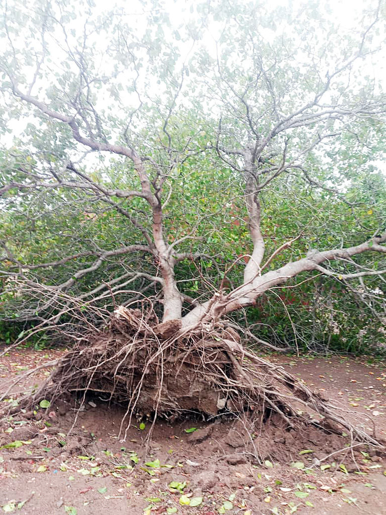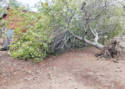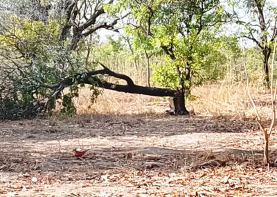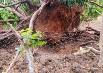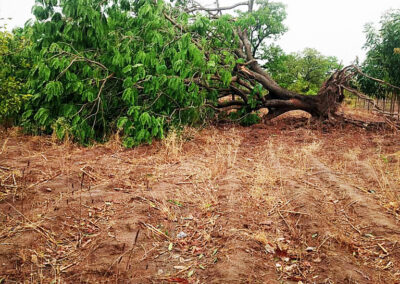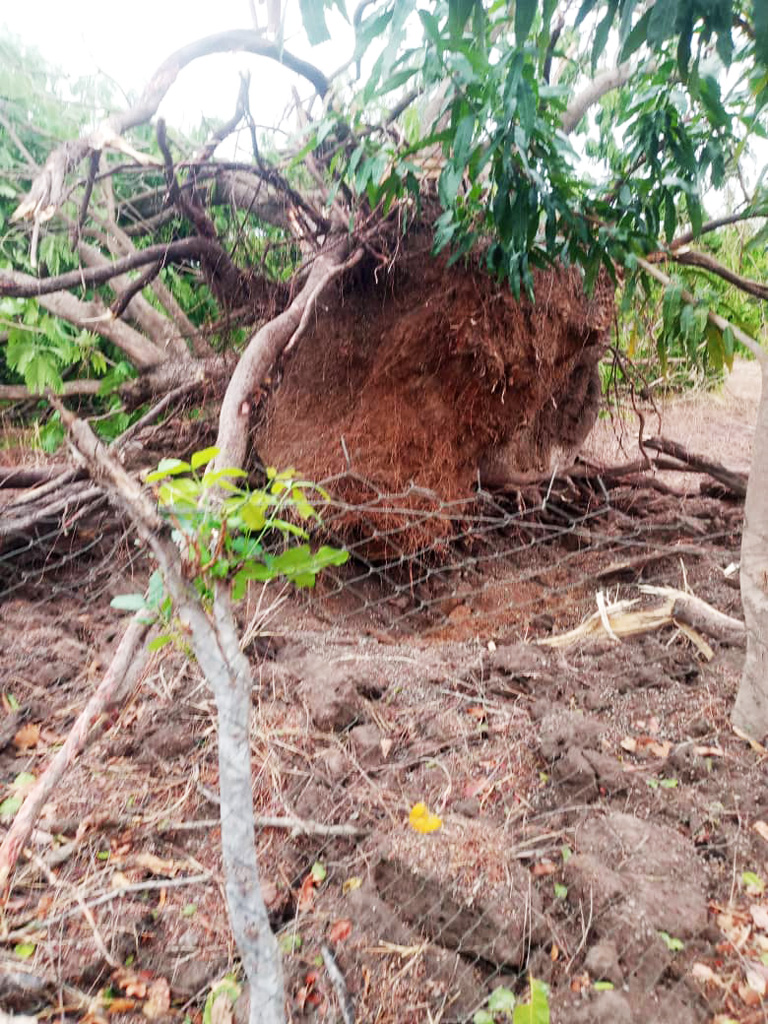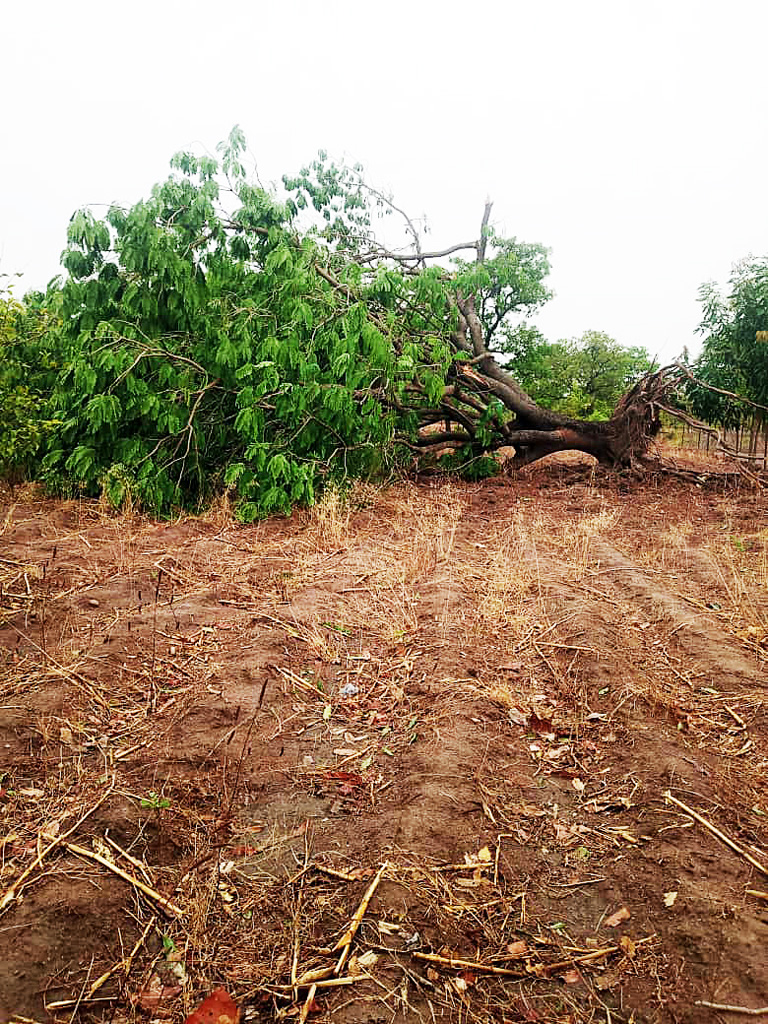 And here is Wiéga, the dog -whose name means ‘peace’-, already signaled some devastation to us!… On the west side of the refectory, a branch of the “néré” fell on our fence needing urgent repair because there is the exit door for our animals: we quickly erected a barricade of spiny tree branches. The wind knocked down almost all the unripe mangoes! Two trees were uprooted: the néré and the cashew nut tree. The néré gives us many of its fruits to make Soumbala, -condiment to season our Burkinabè meals-, and the cashew tree that attracts children from school and church to feast on its fruits and guarantees us its nuts to support our income generating activity (RGA)! Moreover, this tree hosts the fraternity of Catholic couples for their monthly meeting and it dampens the heat from the sun’s rays on our building: we called it the «refrigerator of our refectory» ! Moreover, we appreciate the beautiful melody of the birds that use it to rest, recover and continue their work of procreation.