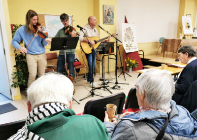 – ¡Son nuestras hermanas mayores de la Casa Madre y de Ker-Anna! En estas casas se trabajan al máximo las capacidades cognitivas y sensoriales en relación con los empleados de la casa y los grupos externos: aquí, «el cielo azul», allí, el centro de ocio infantil… Así es como, tras reflexionar, surgen proyectos ecológicos adaptados a las capacidades de los residentes. Así nos lo explica Alexine, HES, mientras nos muestra las fotos de dos pequeños jardines en macetas de la Casa Madre, llenos de fresas y plantas aromáticas; Sophie, coordinadora, presenta el mural otoñal de Ker-Anna, realizado por los niños con el apoyo de las hermanas mayores, que llevan a cabo muchas otras acciones ecológicas.