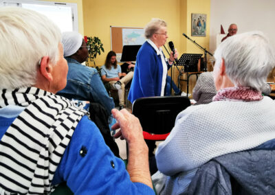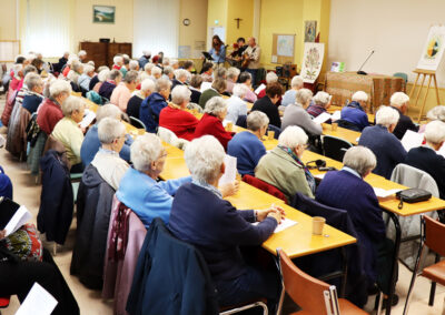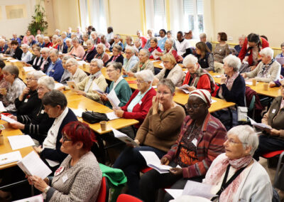 Nos espera una calurosa bienvenida, favorecida por la larga y minuciosa preparación de la jornada por parte de la Comisión Laudato Si’. Al son de la música y los cantos de Bruno GAUTHIER, compositor de cantos litúrgicos, y de su equipo de músicos, la sala se llena de felices reconocimientos que nos vuelven a unir…