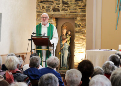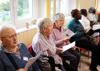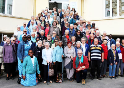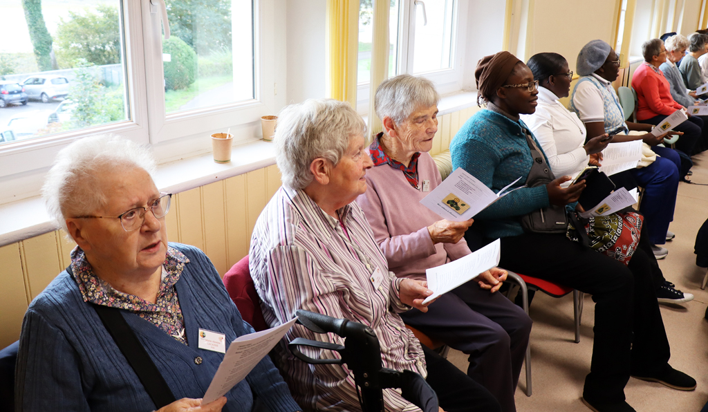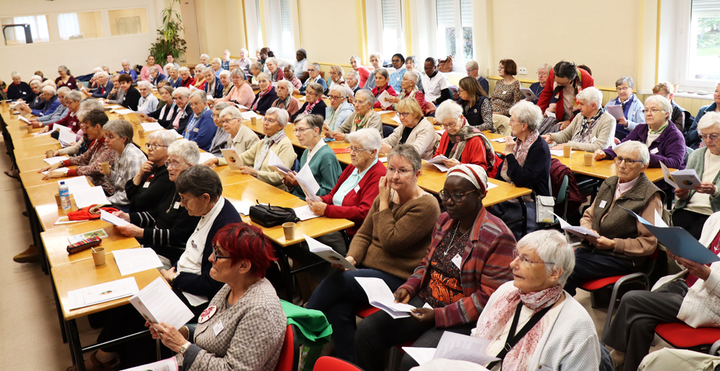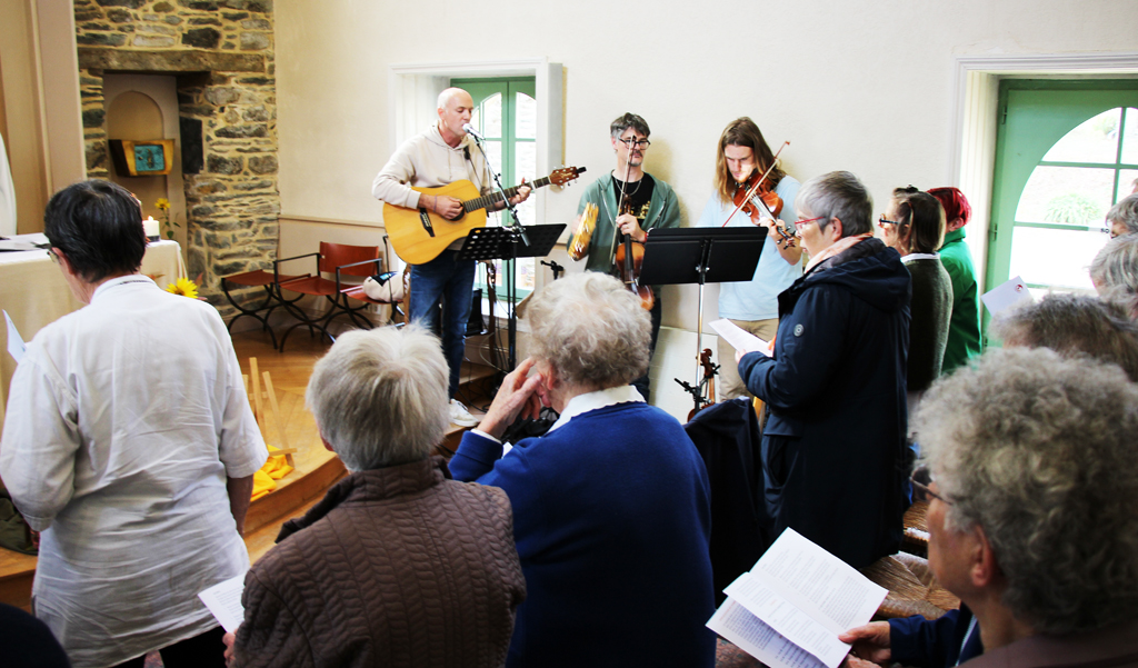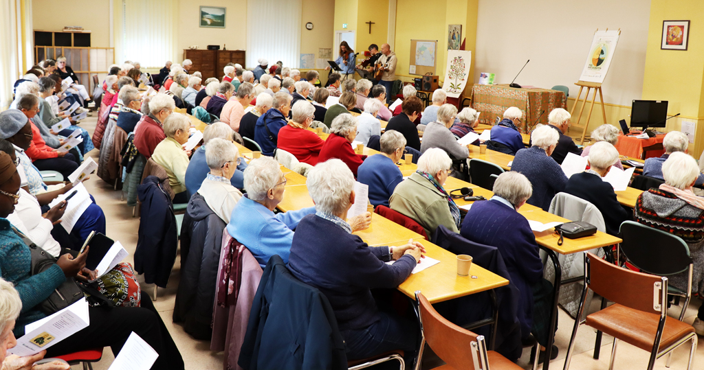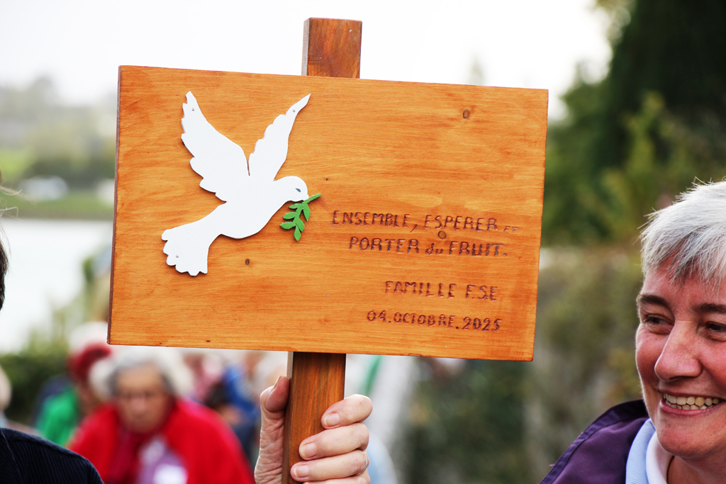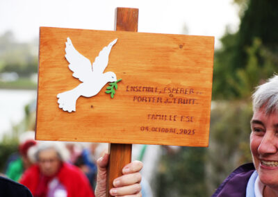 El día termina con la celebración eucarística presidida por nuestro animador Patrick. Como «peregrinos de la esperanza», cantamos nuestra «fe en el Espíritu que nos envía… a levantar todas las barreras, a arriesgarnos por un camino de justicia y paz, a dar testimonio de una Iglesia que sale ». El globo terráqueo, nuestro «libro de vida» y nuestros estatutos, un terrario junto con el pan y el vino, traídos en la procesión de ofrendas, expresan nuestro deseo de conectar todo en nuestras vidas. Esto es precisamente lo que nos exhorta Ann Almodóvar en su enérgica palabra de despedida: con su palabra, nos comprometemos a «acoger la creación como un don, respetarla como a un hermano o una hermana…, hacer de nuestros lugares de vida lugares de evangelización ecológica, convertirnos en artífices de paz y esperanza… cada vez más cercanos a los más vulnerables…».