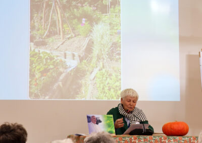 A partir de las 14:00 h, nos ponemos manos a la obra en diferentes talleres. Marie-Thé dirige el «terrario», donde los participantes tienen la oportunidad de convertirse en creadores, y Florence, socia, comparte sus conocimientos sobre bordado… Otros se dirigen al «jardín de hierbas simples», con plantas medicinales y culinarias, al huerto, cuyos productos se comparten con personas en situación de precariedad, o a la viña bien podada, porque «en otoño, ¡tiene que estar bonita!». Estos logros son fruto del trabajo de la asociación GAEW, que se muestra en un vídeo: este tiene la originalidad, gracias al texto que lo acompaña, de conectarnos con el pueblo indígena que, en tiempos pasados, fue despojado por el hombre blanco de su tierra madre, sagrada, su tierra amada por Dios…