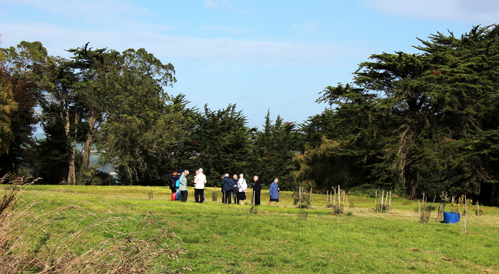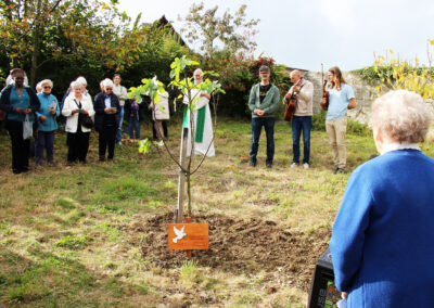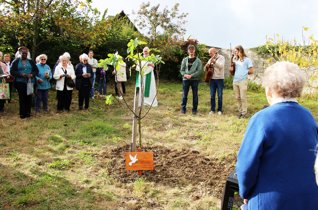 Renovados en nuestros compromisos, subimos en procesión hacia el terreno donde acaba de plantarse una higuera. Llegamos cantando «Levántate ! queremos seguir vivos con aquellos que no tienen nada que esperar… para construir un Reino de amor y ternura». Al pie de la higuera (símbolo de abundancia, como el olivo y la vid), nuestra Superiora general, junto con la Provincial, colocan una placa en la que está grabada una paloma.