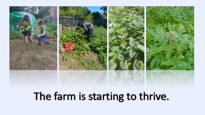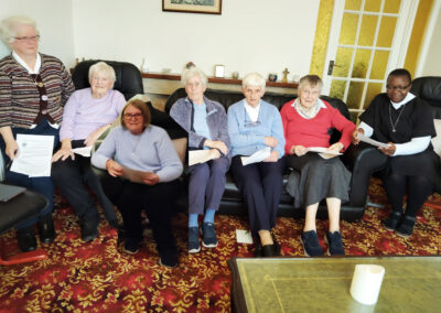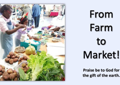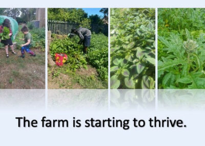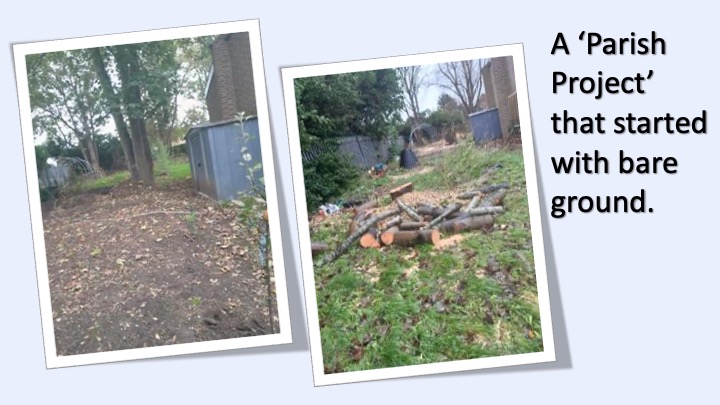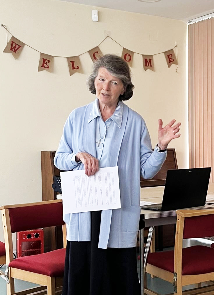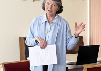 El 4 de octubre de 2025, en un día ventoso pero seco, las hermanas y los asociados se reunieron en la sala parroquial Nuestra Señora Auxiliadora y San Lorenzo, en Olney. Los árboles comenzaban a mostrar sus colores otoñales y las hojas flotaban por todas partes, preparando el terreno para nuestra celebración de Laudato Si’. La lectura de la carta de nuestra Superiora general fue seguida por una reflexión de apertura de nuestra Provincial, Sor Anne Morris (Fig. 1). Después de haber cantado los dos primeros versos de nuestro himno «Todas las criaturas de nuestro Dios y Rey», asistimos a una breve presentación de un huerto floreciente, instalado hace algunos años en una banda de terreno baldío detrás del presbiterio de la iglesia del Cristo-Rey en Bedford por Suzy, una feligresa que ayudó a un grupo de escolares a cultivar verduras. Las fotos (Fig. 2 a 6) dan testimonio de su éxito: este pequeño huerto produce aún una variedad de hortalizas que se venden a los feligreses. Durante el período de COVID, los niños ayudaron a cultivar verduras en casa.
