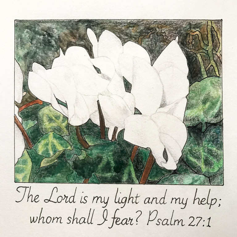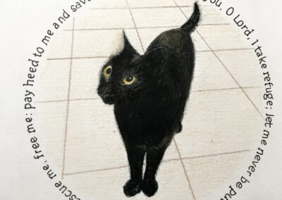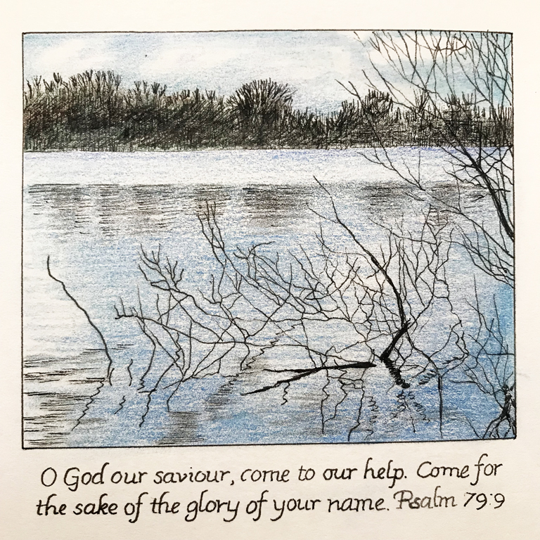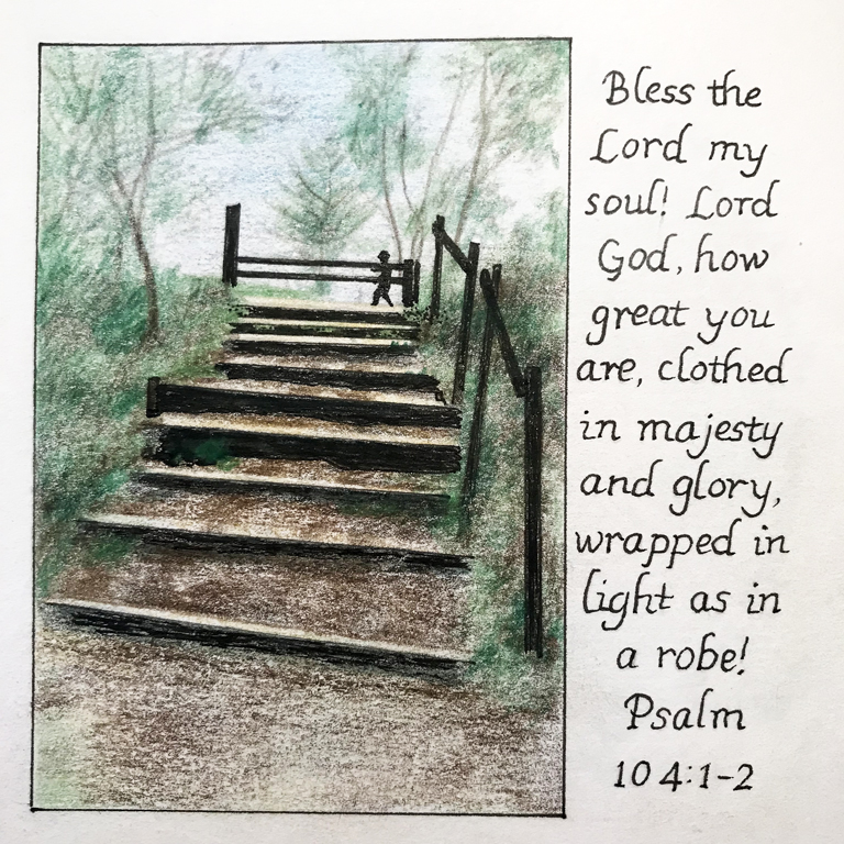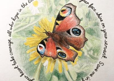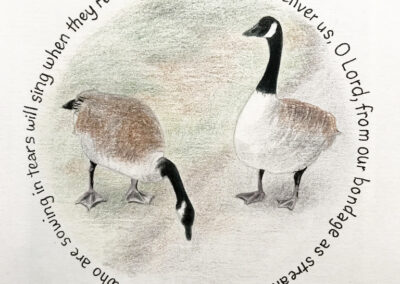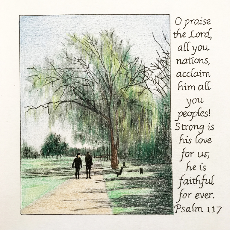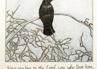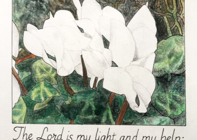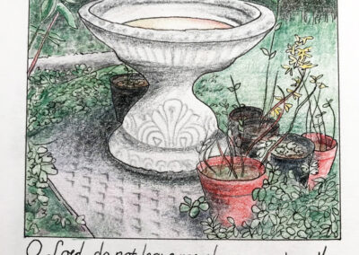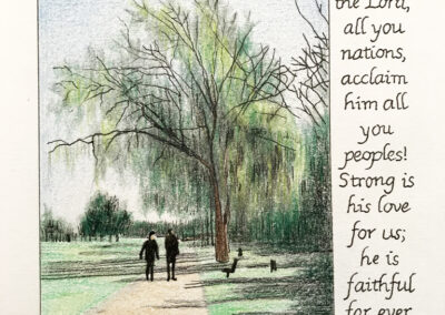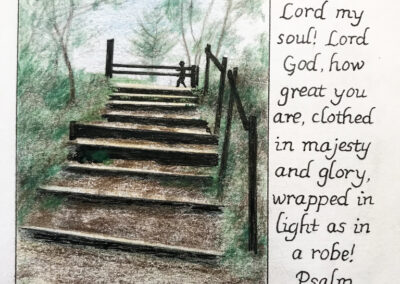 Luego contemplamos, maravillados, una presentación caleidoscópica de 40 magníficas pinturas realizadas por Judy Buchanan, una talentosa asociada de Bedford, que caminaba diariamente en su barrio para CAFOD durante la Cuaresma y el tiempo pascual en 2023. Pintó lo que le llamó la atención durante sus paseos, y cada cuadro fue acompañado por un verso de salmo que invitaba a la meditación. Se presentan las fotos de una selección de sus pinturas, acompañadas de los versos correspondientes (Fig. 7-17). Cada una ofrece una ventana a la contemplación de las maravillas de la creación divina, ya sea la fauna, la flora, los pájaros, o un elemento arquitectónico o una escena callejera que ha llamado su atención!