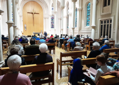 Cambio de horario en la Casa Madre! A partir de las 16h, hubo animación Se anunció un tiempo de oración por la unidad de los cristianos y la capilla acogió a los recién llegados: las comunidades de la Casa Madre pero también gente del exterior. Sorpresa de ver al pie del altar un sintetizador, una guitarra y sus músicos! Había familias, a veces con niños pequeños.  Sor Anne DONNELLY, referente de la Congregación en la Casa Madre, agradeció por su presencia al Pastor David LORIERO, de la Iglesia Evangélica de Pentecostés que vino a rezar con nosotros desde este primer día de la Semana de oración por la Unidad de los Cristianos y Zahi Paul CHEMALY, delegado diocesano para el ecumenismo. – Las hermanas de la EHPAD ‘Jeanne Guernion’ conocen bien a una de sus enfermeras, Dalel, y han descubierto que es la esposa de David LORIERO: lo que la hace más cercana a Dalel y nos abre a la diferencia. El pastor ha invitado a la asamblea a rezar respetando las formas que adopta la oración cristiana. Su voz fuerte y vibrante expresaba su fe, más allá de las turbulencias de nuestro tiempo. Él nos animó, como residentes en este EHPAD, a creer en nuestro lugar, en la importancia de nuestra oración, a suplicar al Espíritu Santo que siga guiando a su Iglesia hacia la unidad: Iglesia santa, esposa en devenir para Cristo (extracto del Credo rezado en esta ocasión).