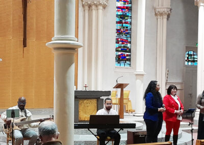 Durante el tiempo de silencio que fuimos invitadas a hacer, quedamos marcadas por el recogimiento de las cantantes y los músicos que nos hacían frente: rezaban personalmente, con los ojos cerrados, sin ruido, pero se veían sus labios moverse en un diálogo interior y a veces una mano se levantaba en un gesto de insistente súplica.