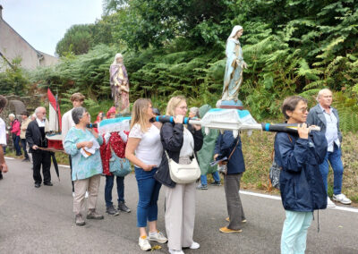 La peregrinación atrajo a entre 90 y 100 participantes, entre veraneantes y residentes locales, incluidos nosotros, de Beuzec, a unos treinta kilómetros. Nos unimos a la procesión y caminamos hasta el lugar donde se celebraba la Eucaristía. Estandartes de diferentes grupos, portadores de cruces, dos estatuas de Notre-Dame llevadas por voluntarios, hombres y mujeres vestidos con trajes tradicionales bretones, todo ello contribuía al imponente aspecto del acontecimiento. Un carro tirado por caballos transportaba la estatua de Notre-Dame-de-Lanriot. A medida que avanzaban, los peregrinos entonaban himnos en bretón, invocando la intercesión de la Santísima Virgen a través del rosario, acompañados por el binioù y la bombarda (instrumentos musicales representativos de Bretaña). Al llegar a la capilla, se colocó la estatua en posición de honor y se celebró la misa al aire libre. El Padre Jean Marc pronunció una homilía en la que destacó la importancia y el lugar de la devoción a María en nuestra vida cotidiana.