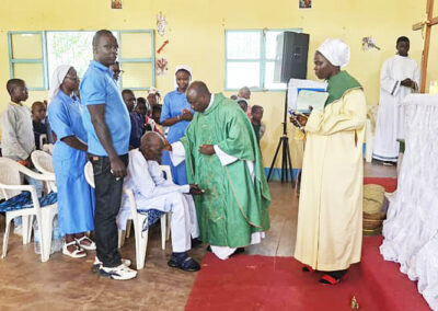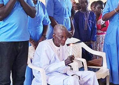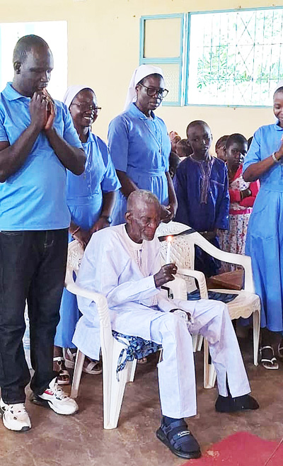 Enfin le jour « J » arrivé il a fallu le porter dans la voiture pour le conduire à l’église. Qu’il était beau, vêtu de blanc par les bons soins de sœur Isabelle et de ses trois novices ! Quelle conviction dans ses réponses aux questions que lui traduisait Rébecca en Fulfulde, à la suite du Curé concernant, entre autres, le Crédo : « Oui, je suis d’accord avec tout ce que vous me dites ». Qu’il était rayonnant son visage, avec sa bougie allumée tenue par les deux doigts qui lui restent à sa main droite !