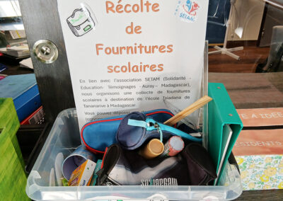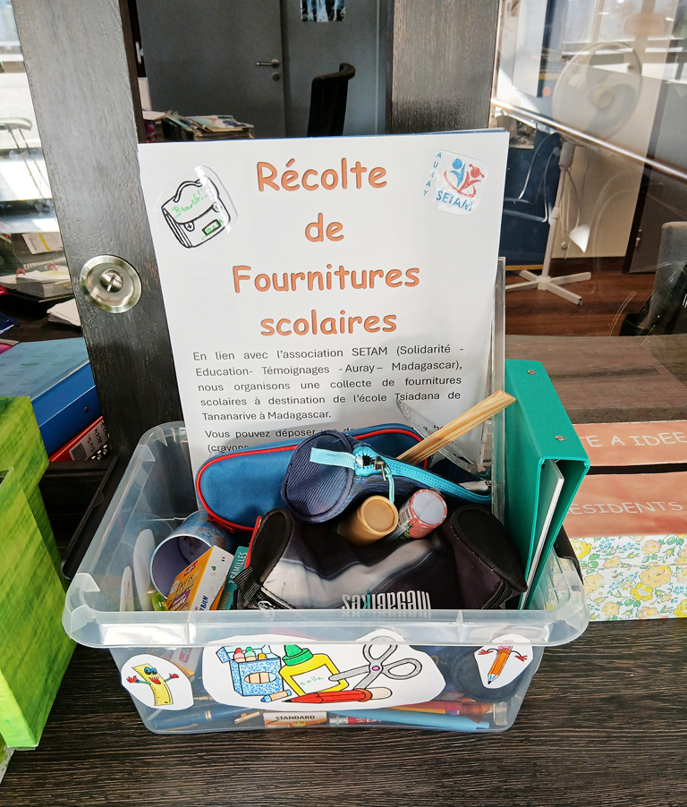 Dans ce cadre, Marc Kernen, responsable de la communication du SETAM, est venu nous rencontrer afin de présenter l’association, ses actions et les réalités du quotidien à Madagascar. À la suite de cette rencontre, un point de collecte de fournitures scolaires a été créé et mis en place à l’entrée de l’EHPAD, permettant à chacun de participer concrètement à cet élan de solidarité. La mobilisation a été telle que le président du SETAM et son épouse sont venus personnellement récupérer la récolte, soulignant ainsi l’importance et la valeur de l’engagement de notre communauté.
